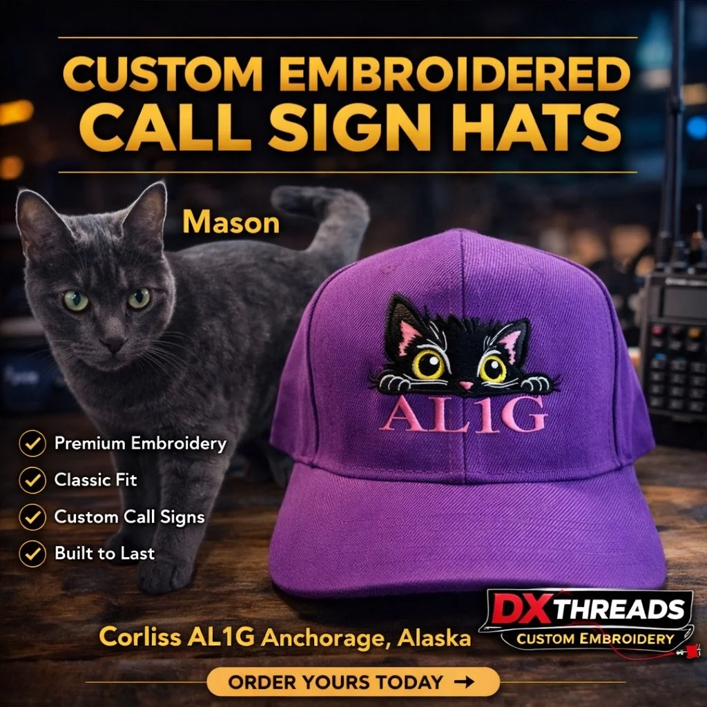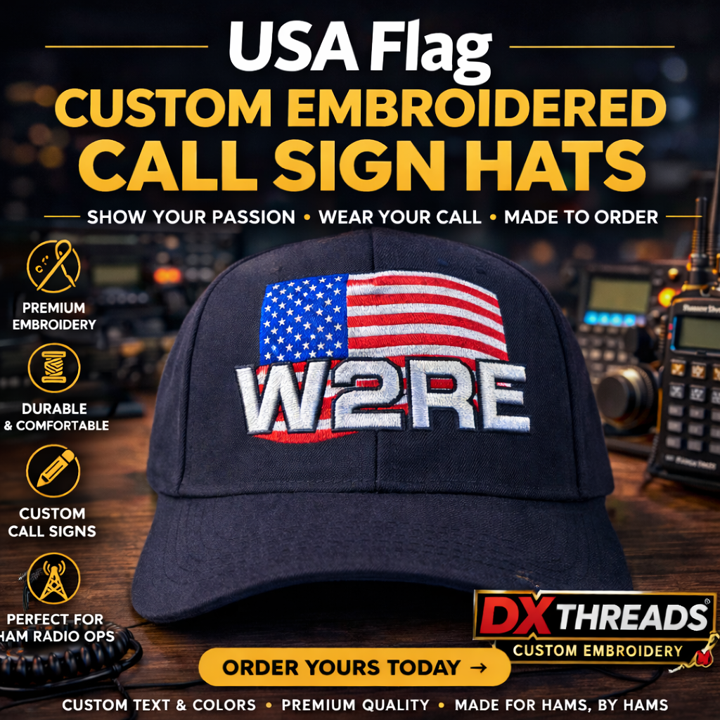 The most popular item so far has been our custom call sign hats. Every hat is made to order — your callsign, your colors, your design. The USA Flag series has been especially popular, with bold embroidery that holds up at Field Day, hamfests, and everything in between.